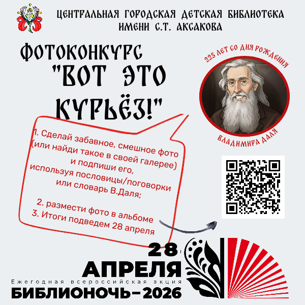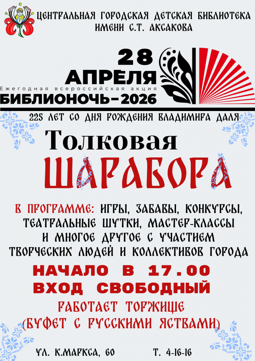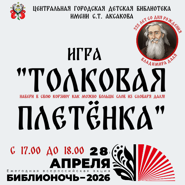Этот вечер будет посвящен жизни и творчеству Владимира Даля. Библиотека превратится в веселую русскую ярмарку. Все гости вечера смогут пройти по "торговым рядам" с самодельными корзинами и соберут в них слова из словаря Даля. Они примут участие в игровых выставках и уголках, посвященных разным досугам и увлечениям Владимира Ивановича. Состоятся и мастер-классы творческих людей города. Все желающие выучат русскую кадриль и хоровод, попробуют себя в столярном деле, устроят бушки (от слова "бушкаться" - бодаться) в шахматы и шашки, посоревнуются в актерском мастерстве и попутешествуют по "дальним далям" - местам, где бывал известный писатель и учредитель Русского географического общества. Закончится вечер ярким фольклорным концертом и подведением итогов. Читатели, набравшие большее количество слов в свои корзинки, будут награждены призами.