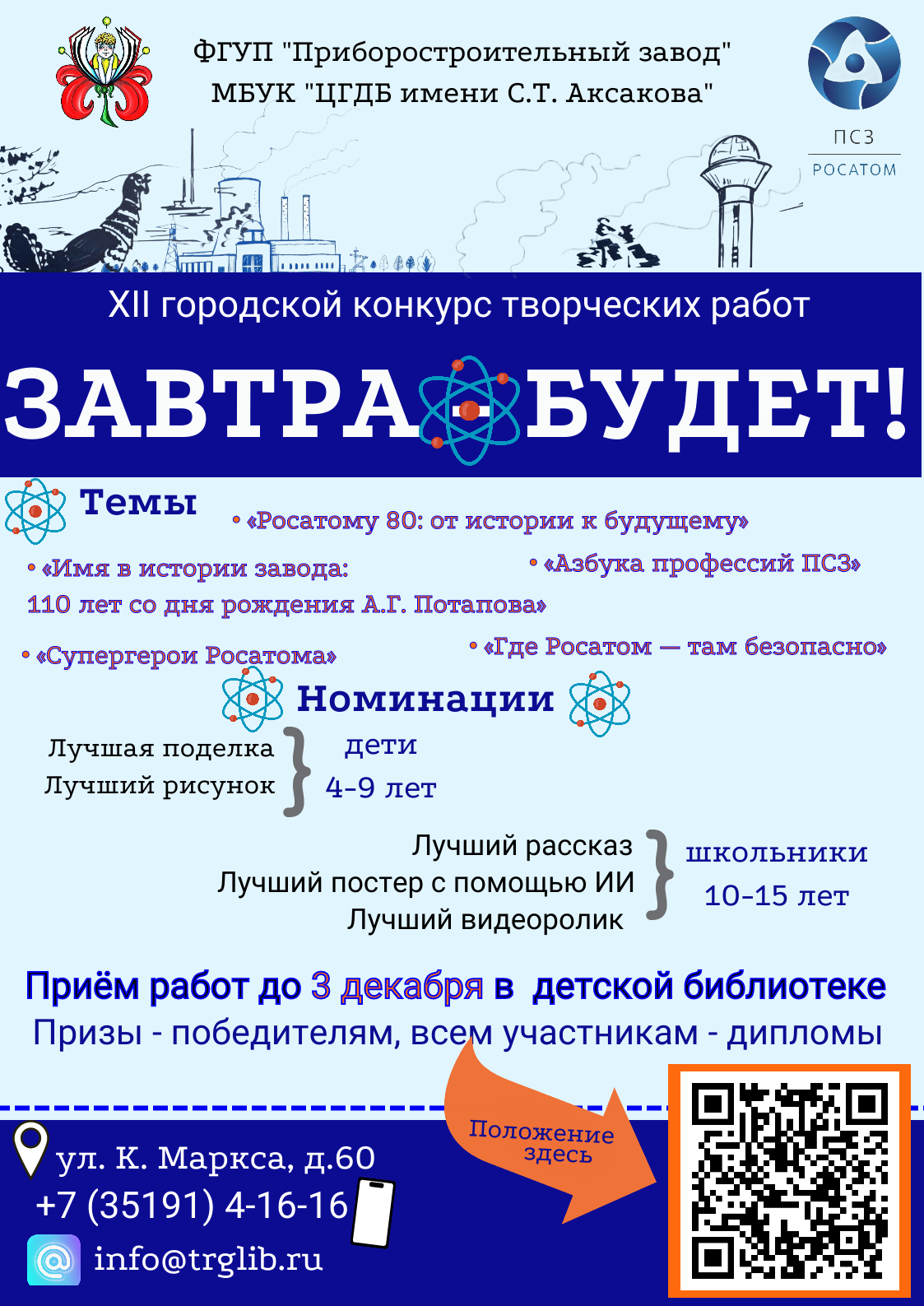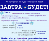 ДАН СТАРТ 12-му городскому конкурсу! ПОДРОБНЕЕ здесь 3 городской конкурс, 2016 год "Завтра - будет!" (2024 г.) 10-й городской конкурс "ЗАВТРА - БУДЕТ!" 2025 год 4 городской конкурс (2017 год) 6-й городской конкурс "Завтра - будет!" (2019 год) 7-й городской конкурс (2020 г.) 8 городской конкурс "ЗАВТРА - БУДЕТ!" (2021) 9 городской конкурс "Завтра - будет!" (2022 г.) V городской конкурс "Завтра - будет!" Буклет "УСАТЫЙ НЯНЬ" ВСТРЕЧАЙТЕ ПОБЕДИТЕЛЕЙ!!! (2014 год) ПОЗДРАВЛЯЕМ ПОБЕДИТЕЛЕЙ! (2013 год) Поездка в информационный центр РОСАТОМа (05.11.2013) Поездка в информационный центр РОСАТОМа (09.10.2014) Положение о конкурсе Работы 3 городского конкурса Работы 4 городского конкурса "Завтра - будет!" (2017) Работы конкурса "Завтра - будет!" (2019 г.) Работы победителей 1-го городского конкурса "Завтра - будет!" Работы победителей 2-го городского конкурса "Завтра - будет!" Смотрите фильм о конкурсе Ток-шоу "Земля. Атом. Будущее?!" Вконтакте